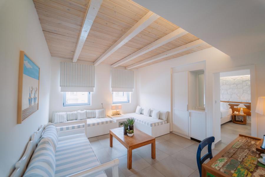 Λιτή διακόσμηση σε αρμονία με φυσικά υλικά αναδεικνύουν τον ιδιαίτερο χαρακτήρα του νησιού και αποπνέουν θαλπωρή και ηρεμία.